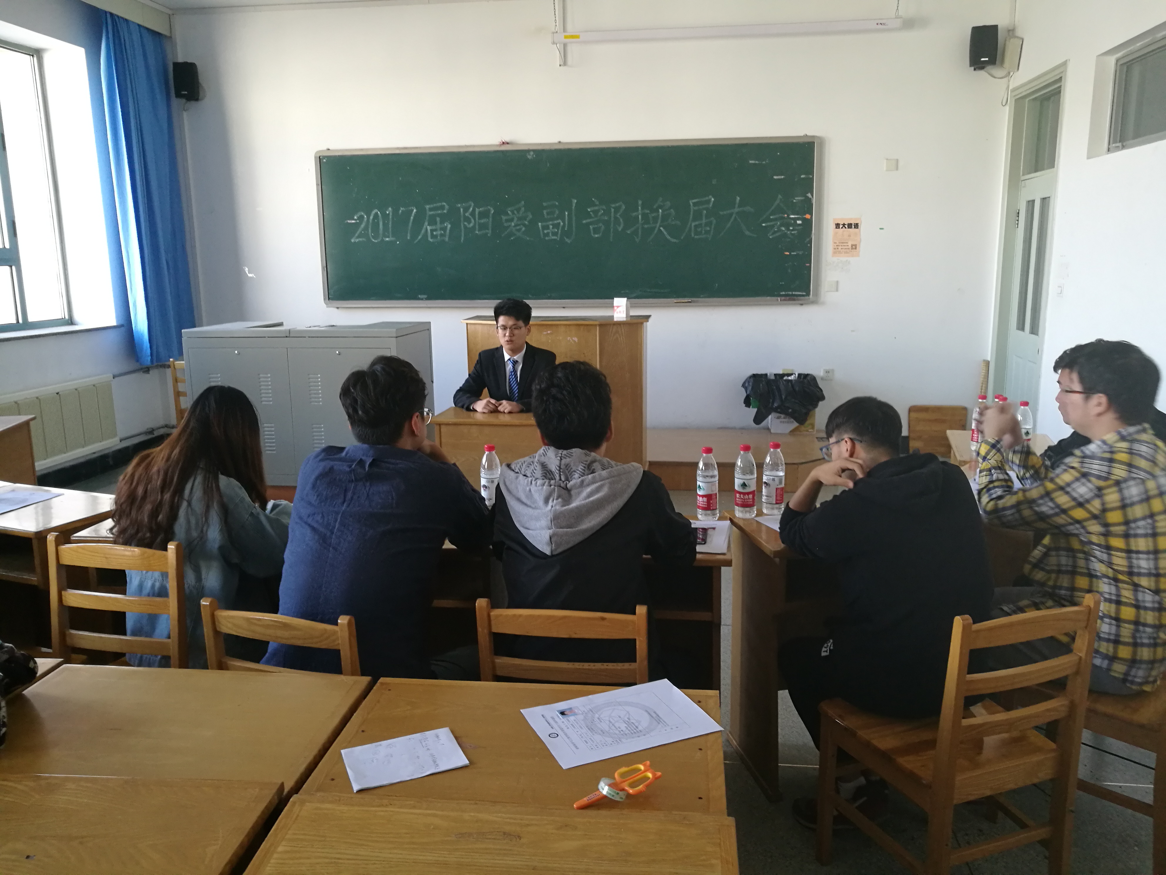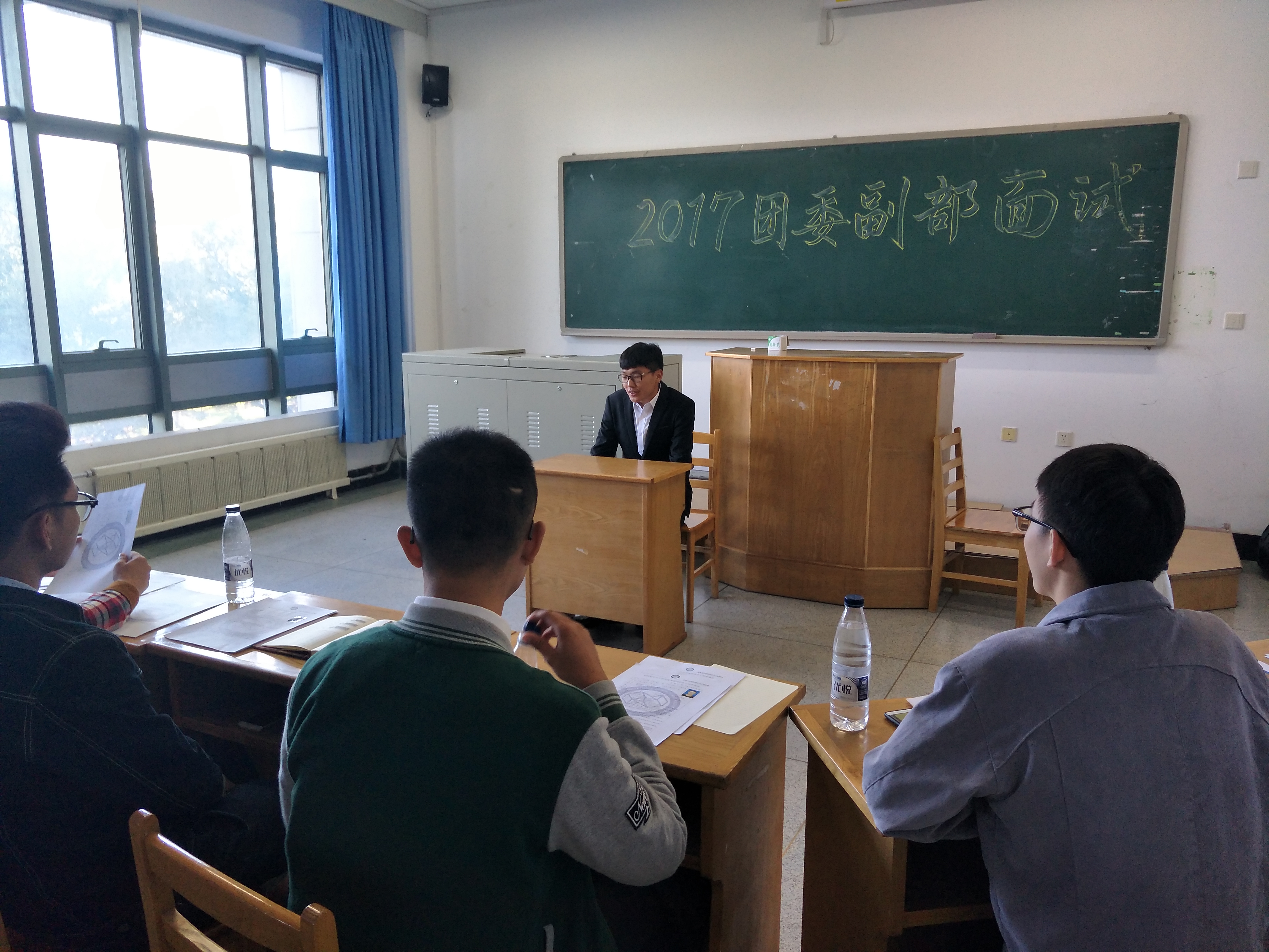 于2017年9月17日在逸夫教育大楼三楼举行了学生干部换届面试。团委书记兼2016级辅导员严冬老师、2015级辅导员佟昊天老师出席了本次换届活动。51吃瓜
