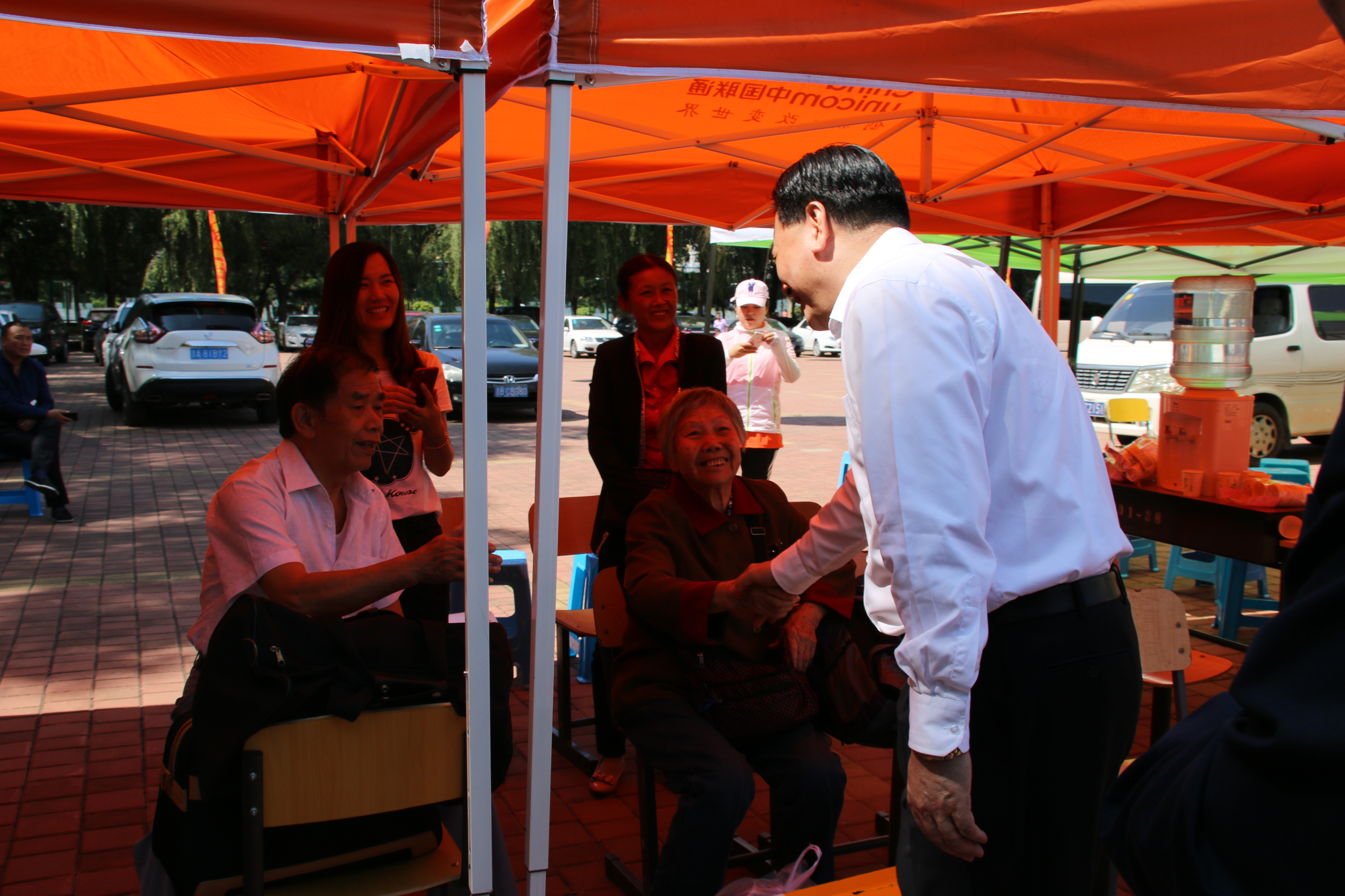 迎新现场,李校长步入场地时面带微笑,先到了家长休息区的位置,并且与和李校长为老乡的家长及孩子握手合影留念,并握着那位同学的手亲切的说“下次见面握手就是你毕业的时候了”。现场气氛十分欢乐。李校长还慰问了正在报道的新生,并嘱咐他们以后要好好学习成为造福国家的人,新生表示能得到李校长的嘱咐非常开心。不少工作人员和志愿者都激动地上去和李校长握手合影,校长都一一答应,态度亲和。在最后,以一张大合照完美结束了李校长的行程。