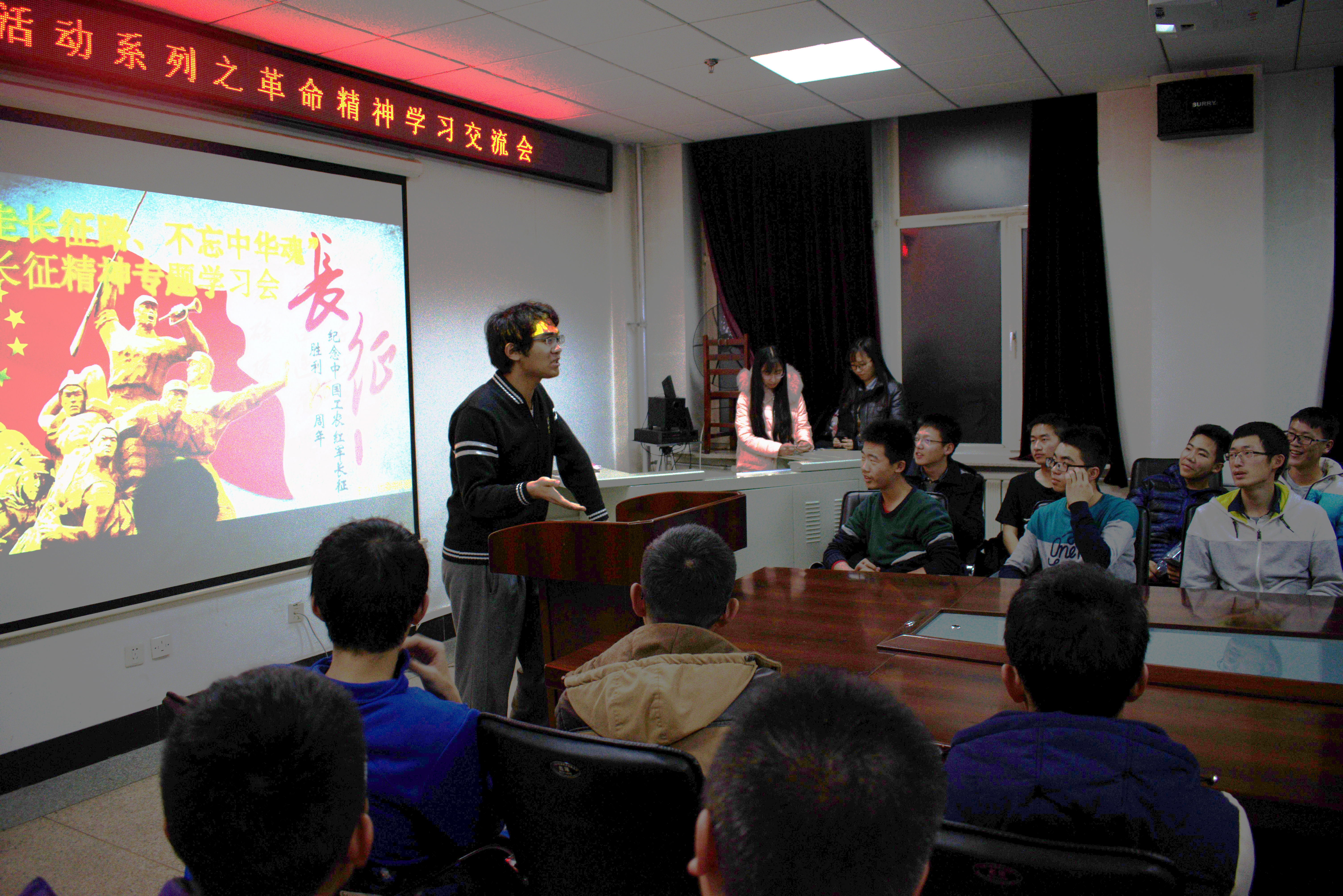 活动中,师生们聆听了长征路上的故事,观看了习近平总书记出席纪念红军长征胜利80周年大会并发表重要讲话的视频。讲话中,习近平总书记深刻总结了长征的伟大意义和精神内涵,提出了弘扬伟大长征精神,走好今天长征路的具体要求。在主持人与同学的分组抢答问答环节中,同学们热情高涨,积极参与,以此方式来增大活动的趣味性,更高效地向学生传播长征知识。随后部分同学与现场人员分享自己所熟知的长征故事,推荐有关红军长征的电影、书籍等。最后,党支部成员做出活动总结,以亲身经历向学生传播自己对长征精神的理解。在激扬的红歌声中学习会圆满结束。
