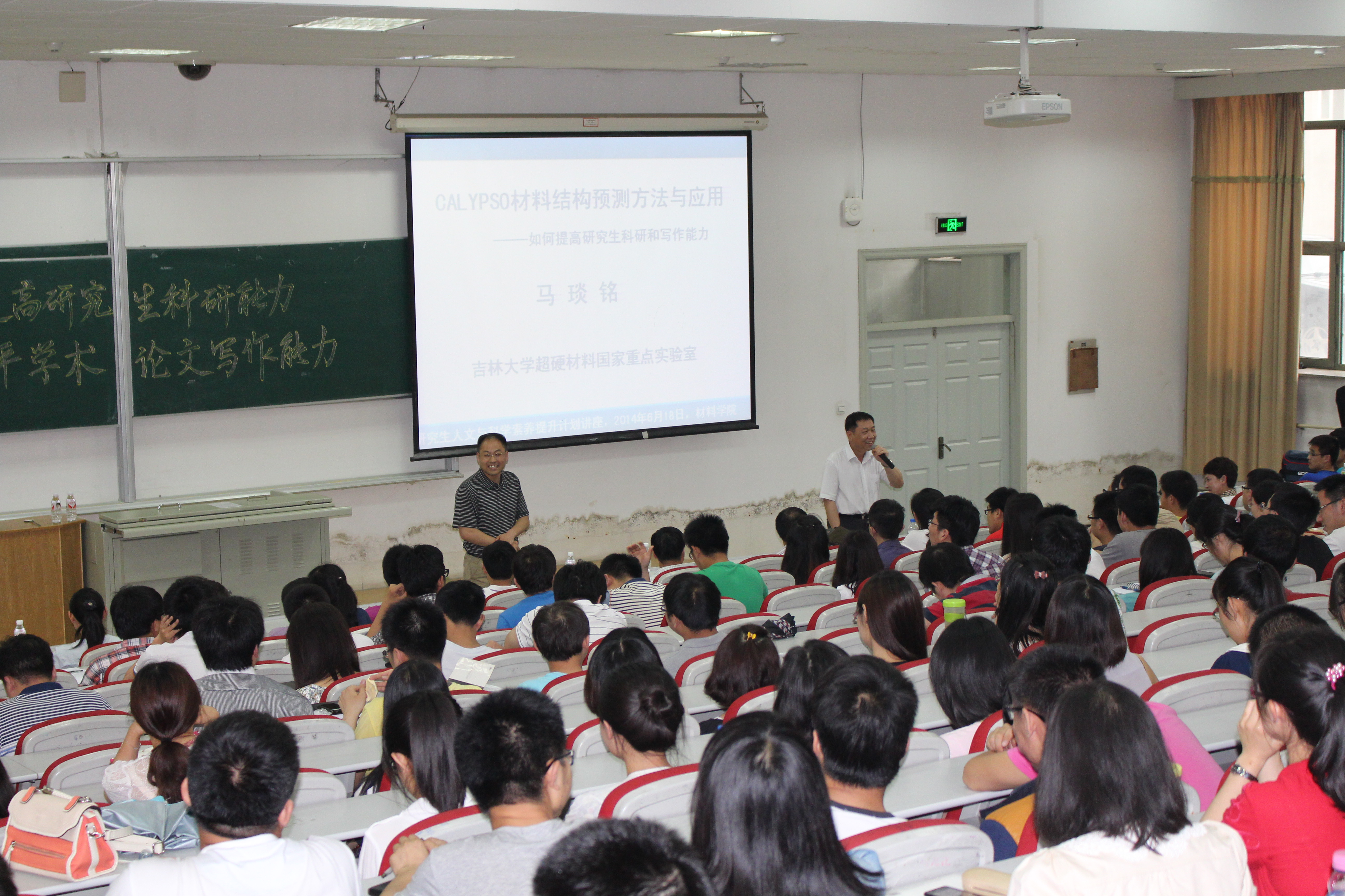 马琰铭教授在简短的自我介绍之后,从毅力、独立、科技前沿的把握及创新思想的提出等四方面多角度的讲述了如何提高研究生的科研能力;随后马琰铭教授又从学习、练习及逻辑思维的培养三方面多层次的论证了如何提高研究生的论文写作能力;最后马琰铭教授结合自己的科研领域深入浅出地讲解了材料结构预测方法与应用研究的学术成果和现有问题。讲座过程中马琰铭教授严谨的治学态度和一丝不苟的科研精神感染着在场每一位同学,同学们不时报以热烈的掌声。