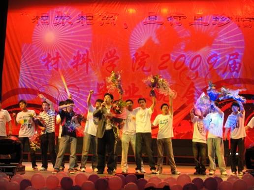 一句句祝福,一声声珍重都随着歌声,舞影融入血液刻在心底。晚会结束后同学们纷纷和老师合影留念。吉大是我家,我家在材料学院,在这里祝愿材料学院09届的毕业生一路顺风,前程似锦!
