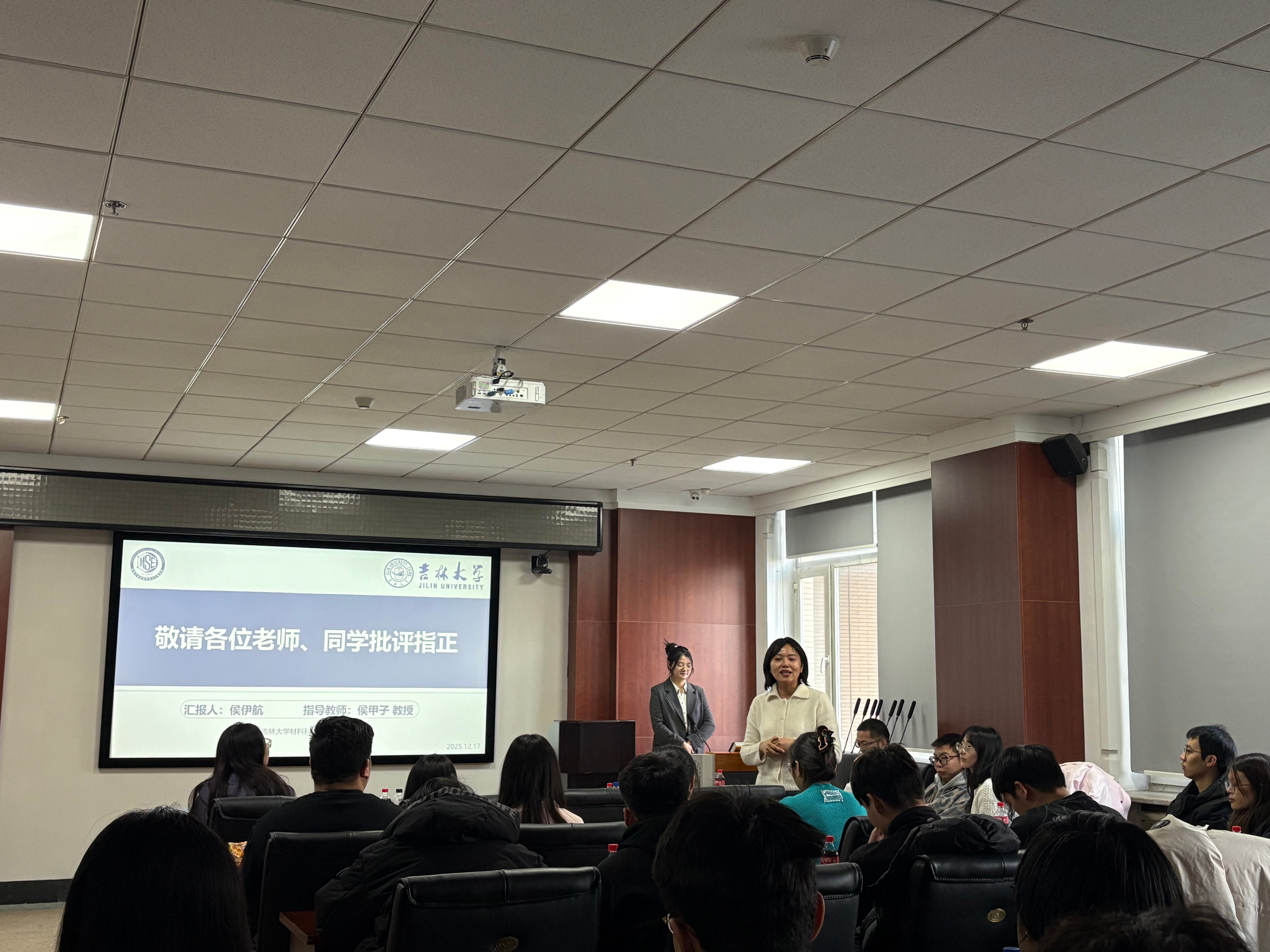 本次学术沙龙还邀请到材料学院辛颖副院长与杨淞老师参加活动。辛颖副院长从学院人才培养、学术氛围的建设出发,肯定了活动的举办意义,同时结合实际工作经验,就活动组织形式、交流实效提升等方面提出建议。此外杨淞老师还给现场积极参与交流互动的同学们颁发精美的小礼品,她们的参与不仅为活动增添了权威性与指导性,更让师生们感受到学院对学术交流的重视与支持。在这一期的学术沙龙当中,侯伊航同学带来了详实且极具启发的科研分享,侯甲子老师则进行了专业到位的点评,还结合研究方向给出了延伸性的指导建议,同学们在拓宽学术视野的同时,也在科研思路上得到了切实的收获。