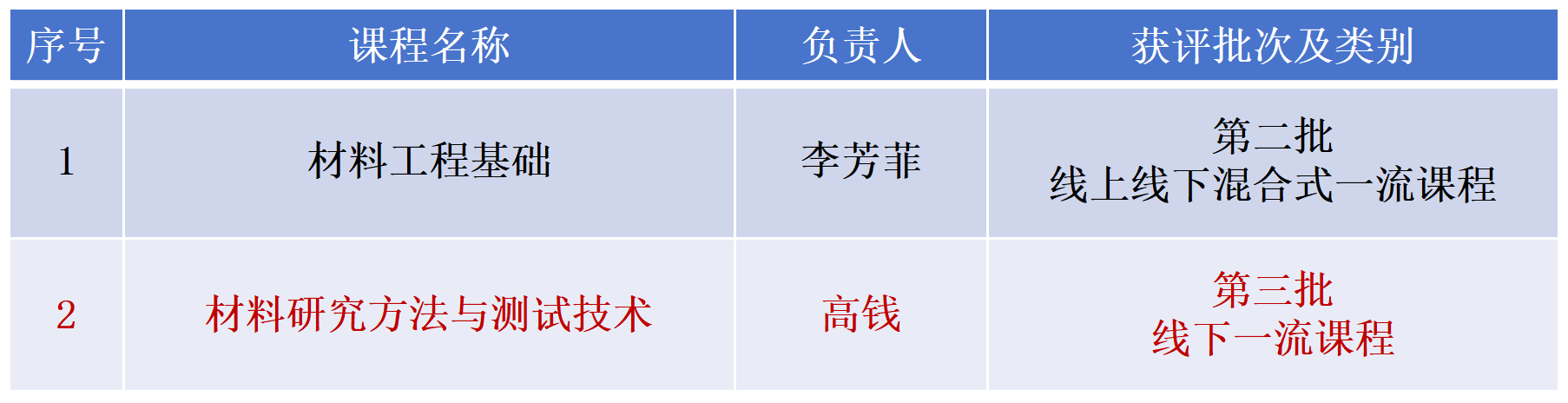 共有2门课程被认定为国家级一流本科课程,标志着学院在本科课程建设与高素质材料专业人才培养质量提升方面取得阶段性重要成果。