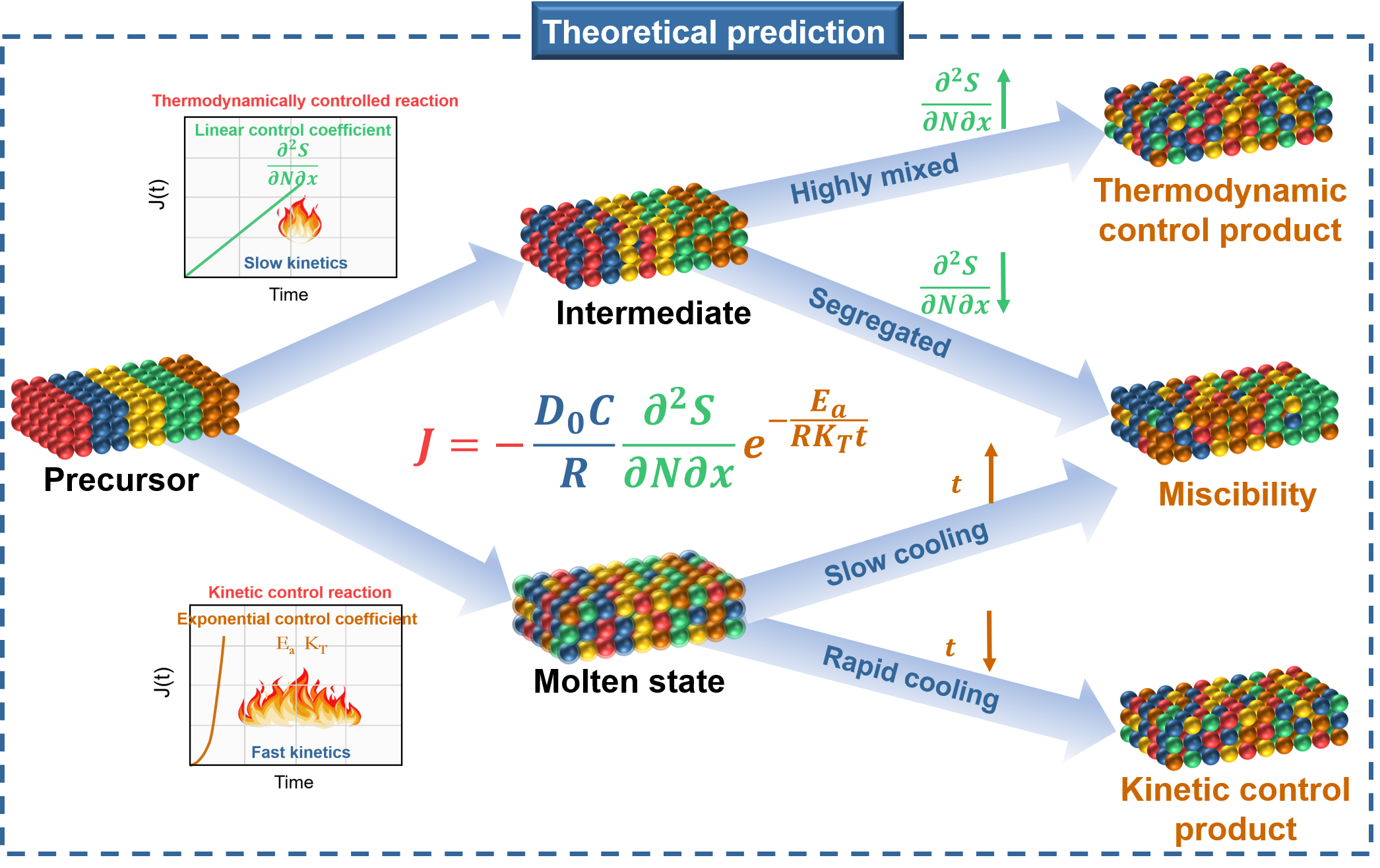 在催化领域,调整催化反应路径和优化催化剂活性是一个重大挑战。在本文中,我们利用离子扩散作为研究框架,推导出了扩散通量驱动力方程的基本形式,并定义了影响合成动力学的线性和指数控制系数。通过操控这些控制系数,我们合成了具有不同动力学控制程度的高熵钙钛矿La(Co0.2Cr0.2Fe0.2Mn0.2Ni0.2)O3样品。相位测试结果表明,调整控制系数导致了不同程度的动力学控制。实验证据和理论模拟表明,具有更高动力学控制比例的样品表现出更快的催化路径,遵循晶格氧氧化机制(LOM),并显示出最高的催化活性。随着动力学控制比例的降低,氧气演化反应(OER)催化路径经历了相应的转变。这些发现为弥合合成设计与催化性能之间的差距提供了新的研究范式。