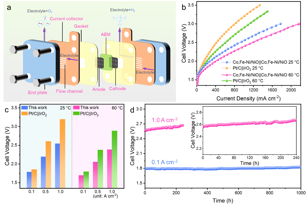 图2:基于自支撑电极构建的阴离子交换膜电解槽性能