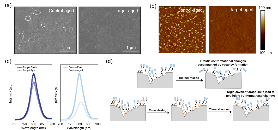 合作团队对剥离的钙钛矿薄膜进行老化处理,交联共SAM修饰的钙钛矿表面基本保持原始形貌(图4a),且经N,N-二甲基甲酰胺清洗后,表面基本无变化(图4b)。交联共SAM具有更高的分子刚性与更致密的空间分布,可最大限度减少基底的暴露,抑制了界面非辐射复合(图4c,4d),克服了长期限制器件性能与稳定性的关键难题。