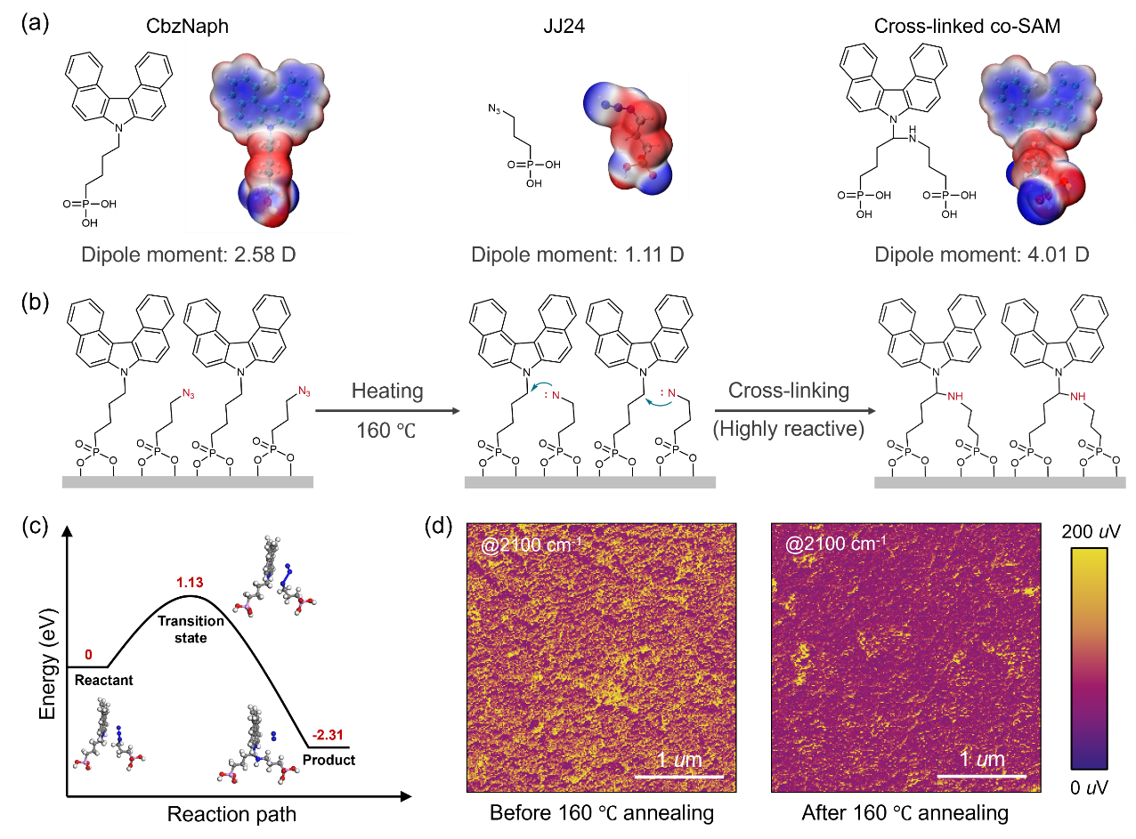 围绕SAM不稳定性、覆盖不均匀性以及外部应力下构象变化等问题,该研究创新性地引入含叠氮基团的可交联客体JJ24,与主体CbzNaph形成交联共SAM,从而增强SAM构象稳定性、抑制缺陷形成,优化界面能级匹配与电荷提取过程。JJ24中线性丙基连接体短于主体CbzNaph的丁基连接体,使其在填充空隙的同时,又能增强SAM间的范德华相互作用(图1a,1b)。且该交联反应具有有利的反应吉布斯自由能(-2.31 eV)和合适的能垒(1.13 eV)(图1c),将共SAM在160℃下退火以激活叠氮基团,可以使CbzNaph与JJ24之间的交联反应完全进行(图1d)。JJ24通过磷酸基团间的氢键与烷基连接体间的范德华相互作用抑制胶束形成,保证SAM的均匀分散。