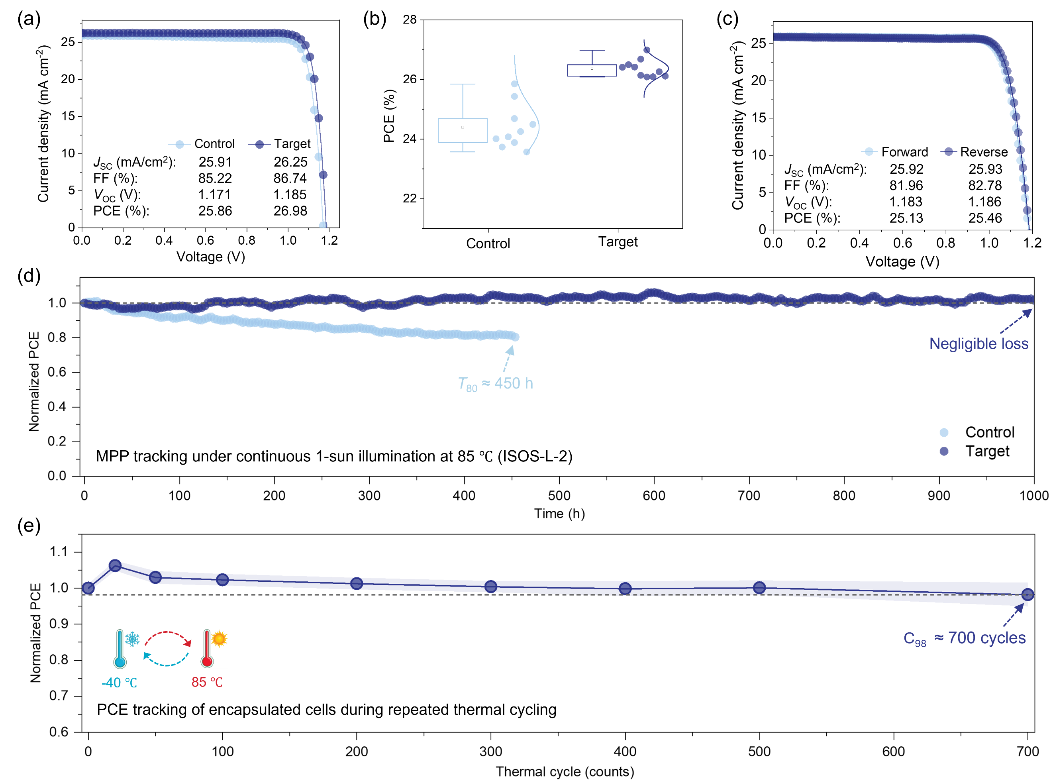 合作团队基于交联共SAM制备的最优器件获得了26.98%能量转换效率(PCE),认证效率高达26.92%(图3a-c)。器件在最大功率点运行1000小时后,PCE几乎无衰减(图3d)。在环境大气、黑暗条件下的反复热循环稳定性测试表现优异,封装后的器件在700次热循环后,仍能保留98.2%的初始PCE值。