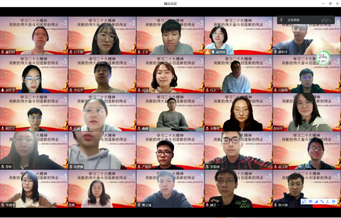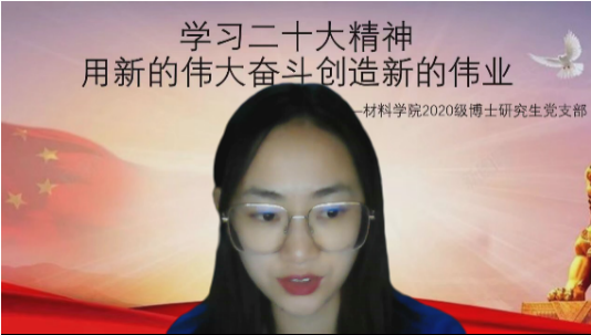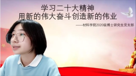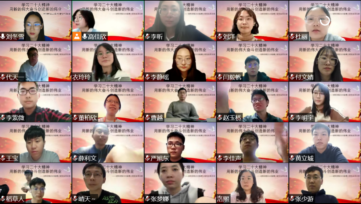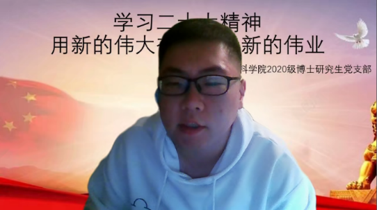 会议由2020级博士研究生党支部书记高佳欣主持。虽然由于疫情原因,会议以线上形式进行,却丝毫不影响党员同志们的交流热情。他们踊跃发言,分享关于党的二十大精神的学习感悟,包括但不限于二十大报告内容,新党章,习总书记在闭幕式上的重要讲话等内容。