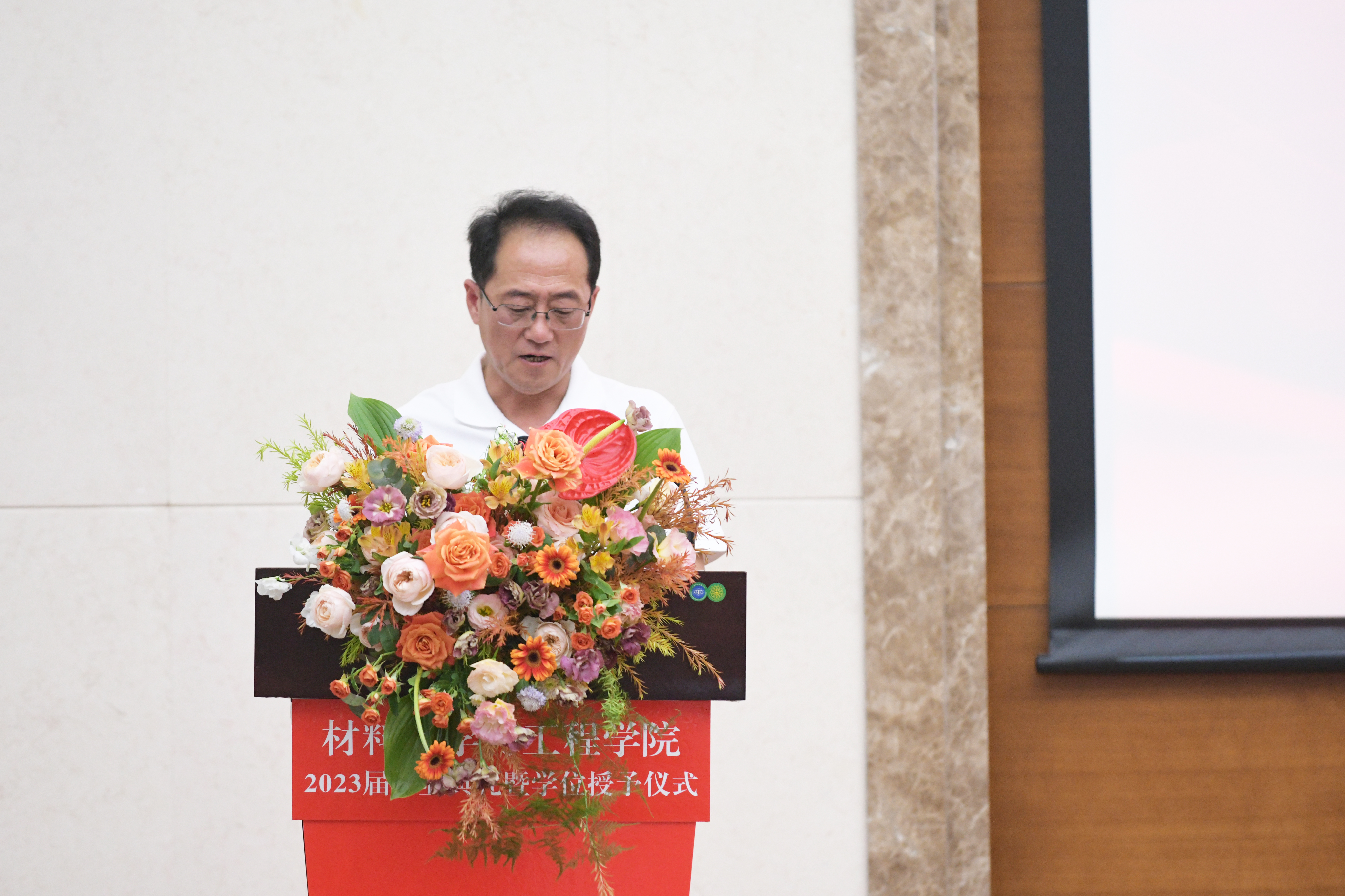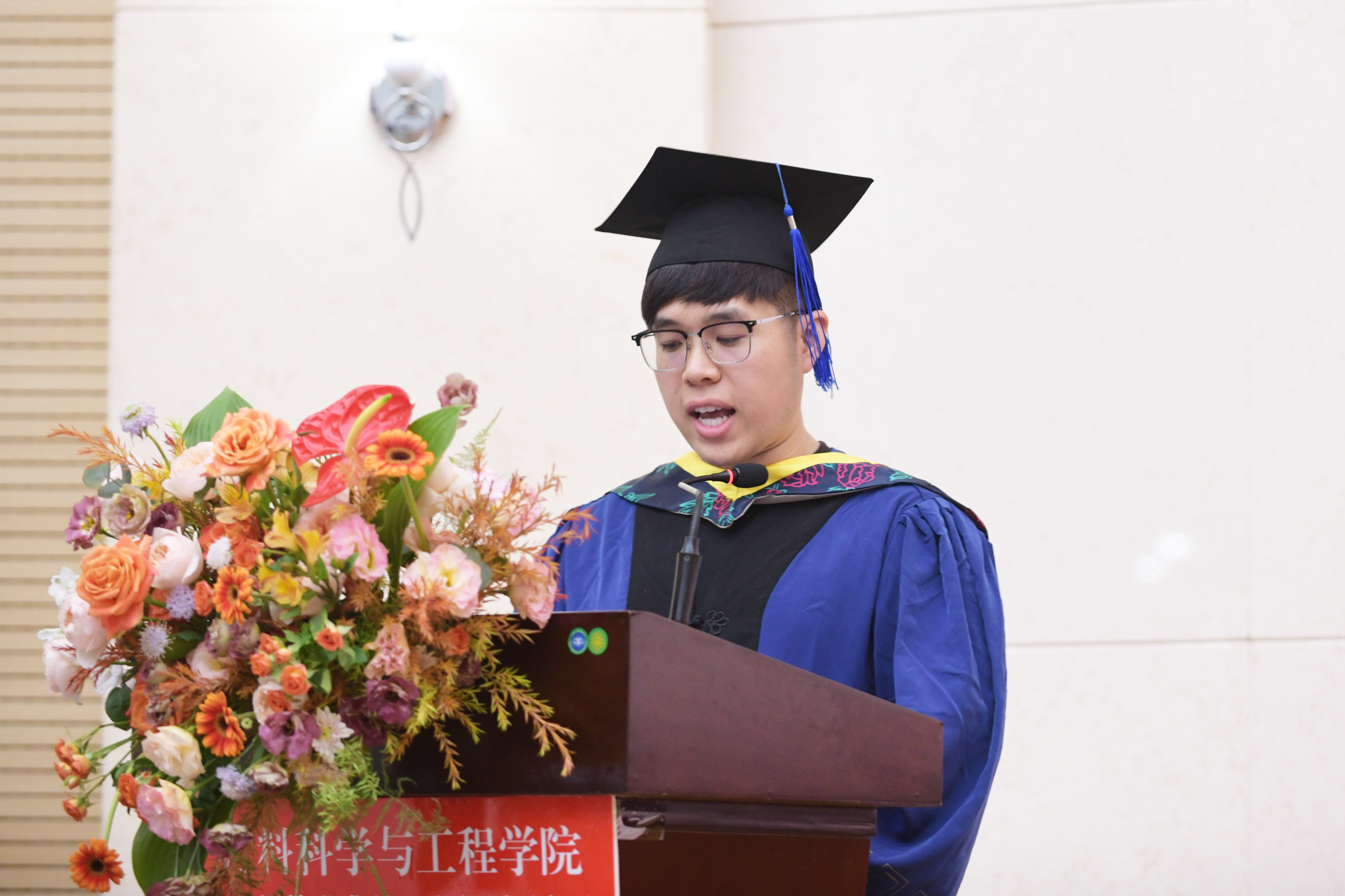 2023届毕业研究生代表张耀文同学发言,回顾在材料学院生活学习的三年时光,对蓬勃发展的的学院、对悉心教诲的师长、对辛勤养育的父母、对全体同学表达感谢。