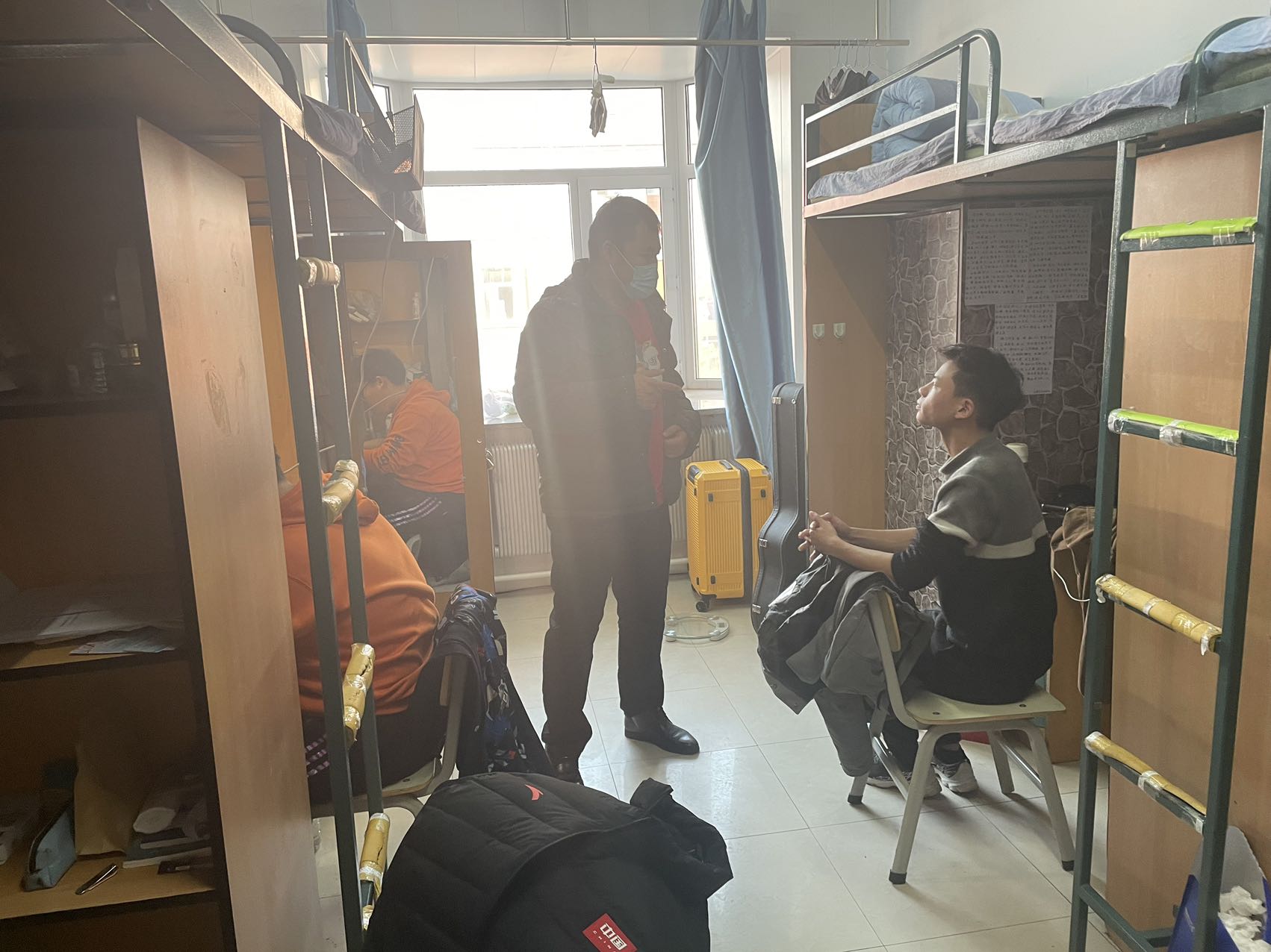 在走访寝室过程中,严老师逐一核对学生返校情况,并且解答了同学们关于学习和生活方面的疑问,提醒大家返校后要及时整理个人物品、打扫寝室,做好新学期的开学准备。针对即将到来的期末考试,严老师提醒同学们,要做好学习计划,处理好期末考试与新课程的关系,同时,严老师还特别强调,返校后要注意校内外各类安全问题,外出期间要佩戴口,注意交通安全,谨防网络和电信诈骗,安全是一切学习和生活的前提。