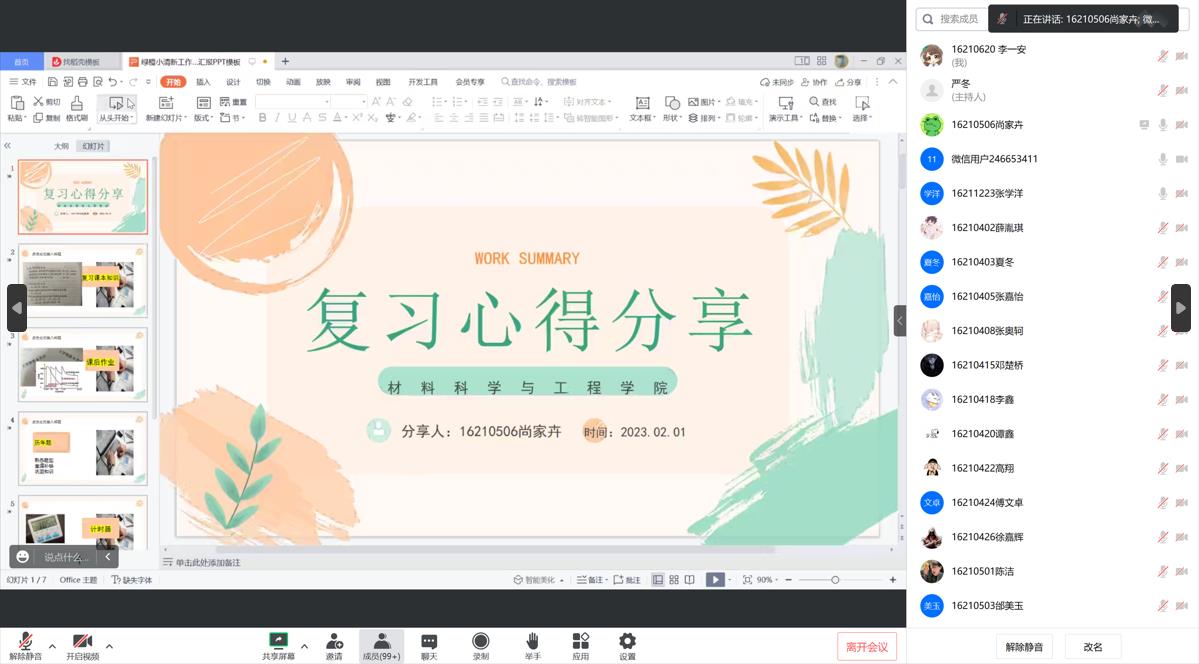首先,由2021级材料科学与工程专业张学洋、刘东宇,无机非金属材料工程专业尚家卉,材料成型及控制工程邝志强等四位同学从复习内容梳理、复习时间规划、复习节奏把握等方面进行学习经验的分享和交流,并结合自身学习情况对期末复习的各门科目提出了复习备考建议。
