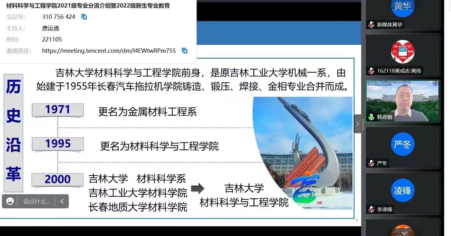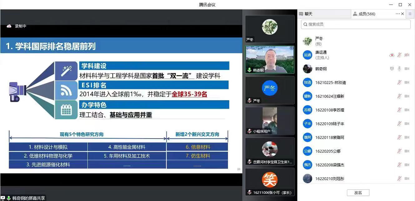 2021级专业分流介绍暨2022级新生专业教育会议在腾讯会议线上召开。学院副院长韩奇钢教授,学院党委副书记兼副院长华蕊老师、材料科学系主任王海涛教授、金属材料工程系主任王国勇教授、高分子材料与工程系主任于开锋教授、无机非金属材料工程系主任苗世顶教授、材料加工工程系主任赵小辉教授、学院教务办公室和学生工作办公室的各位老师们受邀参与,2021、2022级全体本科生及部分学生家长参加,会议由2021级辅导员严冬老师主持。