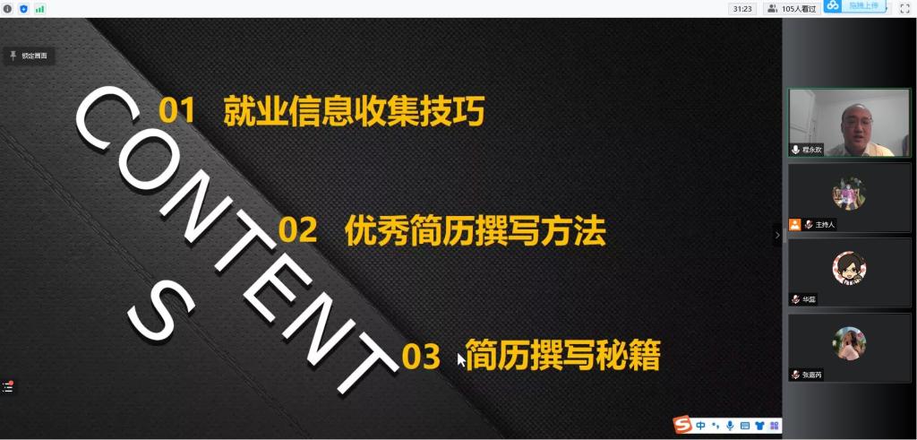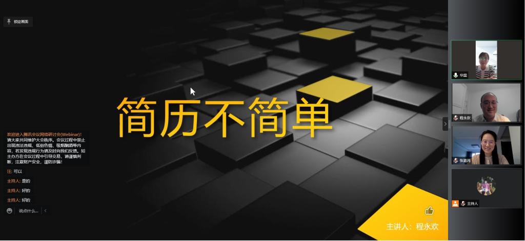 本次会议邀请到程永欢老师,程永欢老师是《大学生职业生涯导航讲座》公益讲师,曾多次受邀到多所高校进行就业指导,具有多年校园招聘服务行业经验。会议伊始,程永欢老师向大家介绍了就业信息收集技巧,包括就业流程,简历使用场景等;然后向大家具体讲述了优秀简历撰写方法,针对于简历的必要组成因素,特别强调了简单明了和数据量化的重要性;最后向大家讲解了自己多年来积累的个人简历技巧。