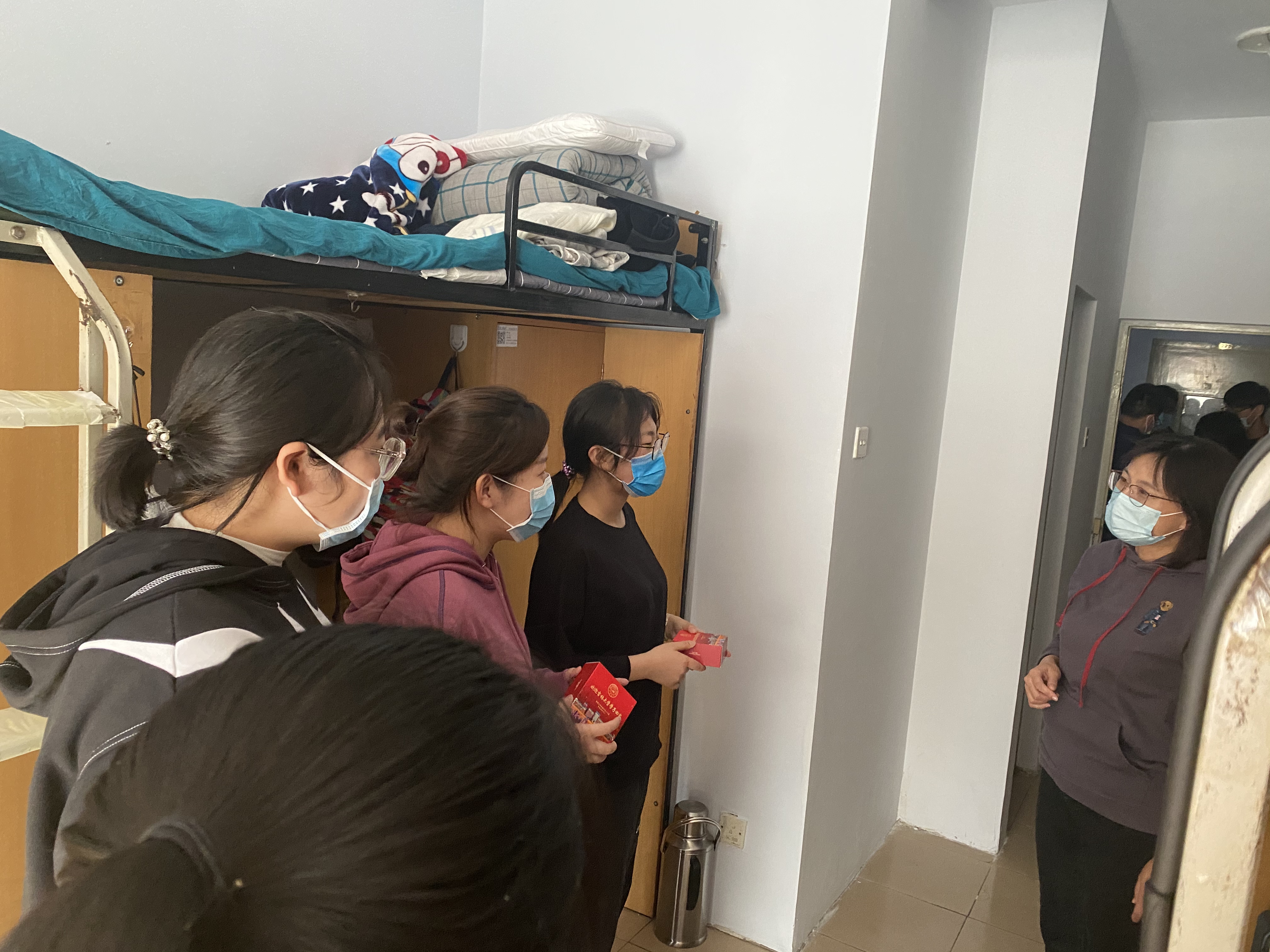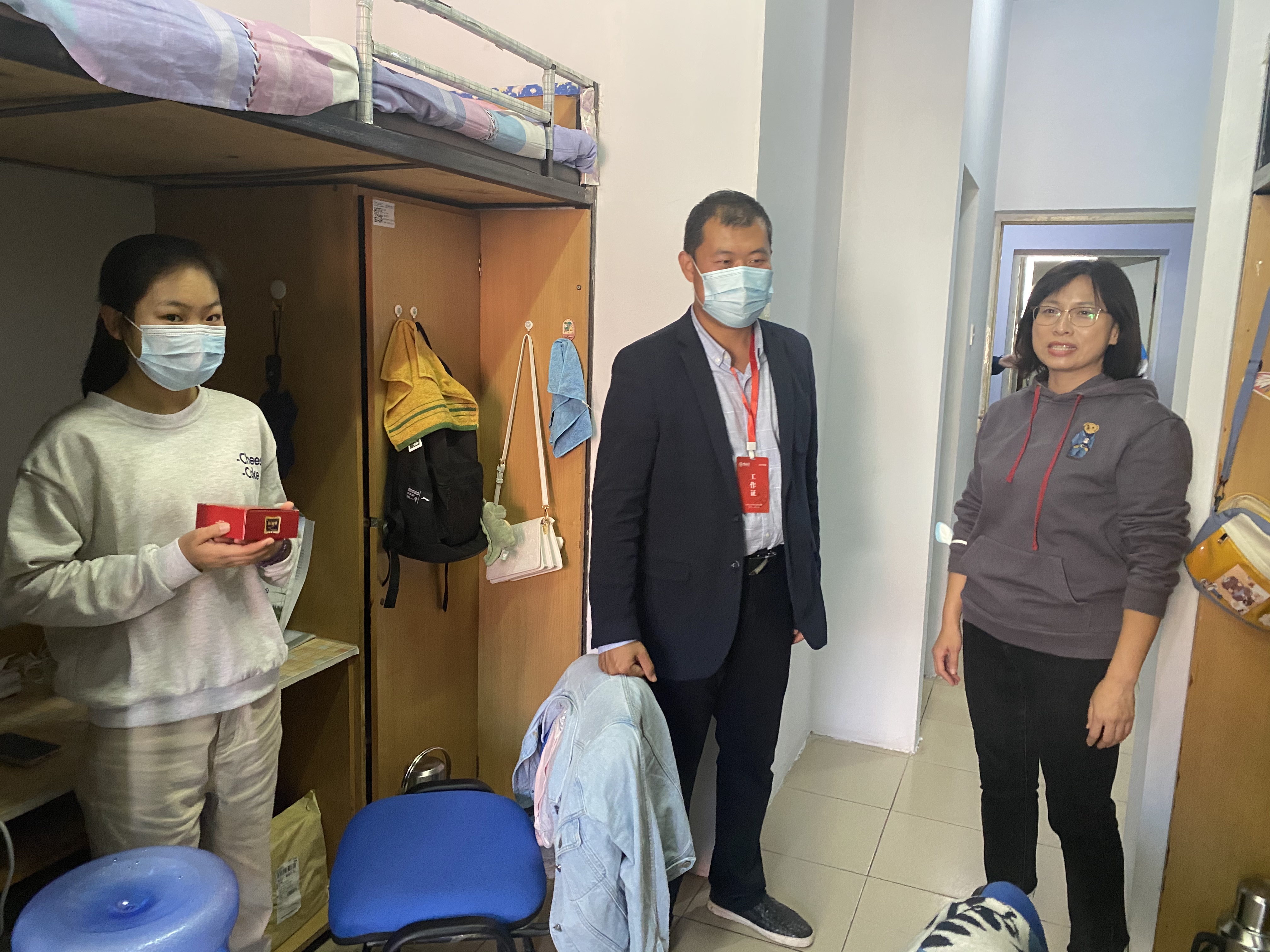 在走访过程中,学院领导向新生们表达了学院的问候和关怀,为2021级同学分发月饼和苹果,并与新生们亲切交谈,仔细询问新生在学校衣、食、住、行各方面的问题,认真聆听学生对学校环境、学院迎新工作的感受,详细了解每位新生的基本情况和入学报到后的体会。