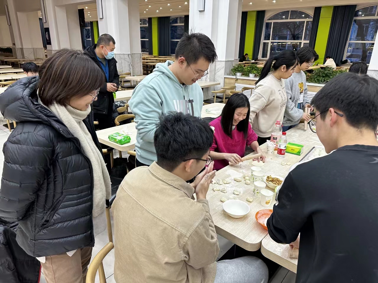在活动过程中,同学们互相帮助、互相学习,不仅提高了自己的动手能力,也增进了彼此之间的感情。同时,通过这次活动,大家也更加深入地了解了中国传统文化,感受到了浓浓的新年氛围。为了增加活动的趣味性,现场还悬挂了“材聚一堂,师生同贺,饺暖人心,年年有料”的横幅,为活动增添了不少节日气氛。