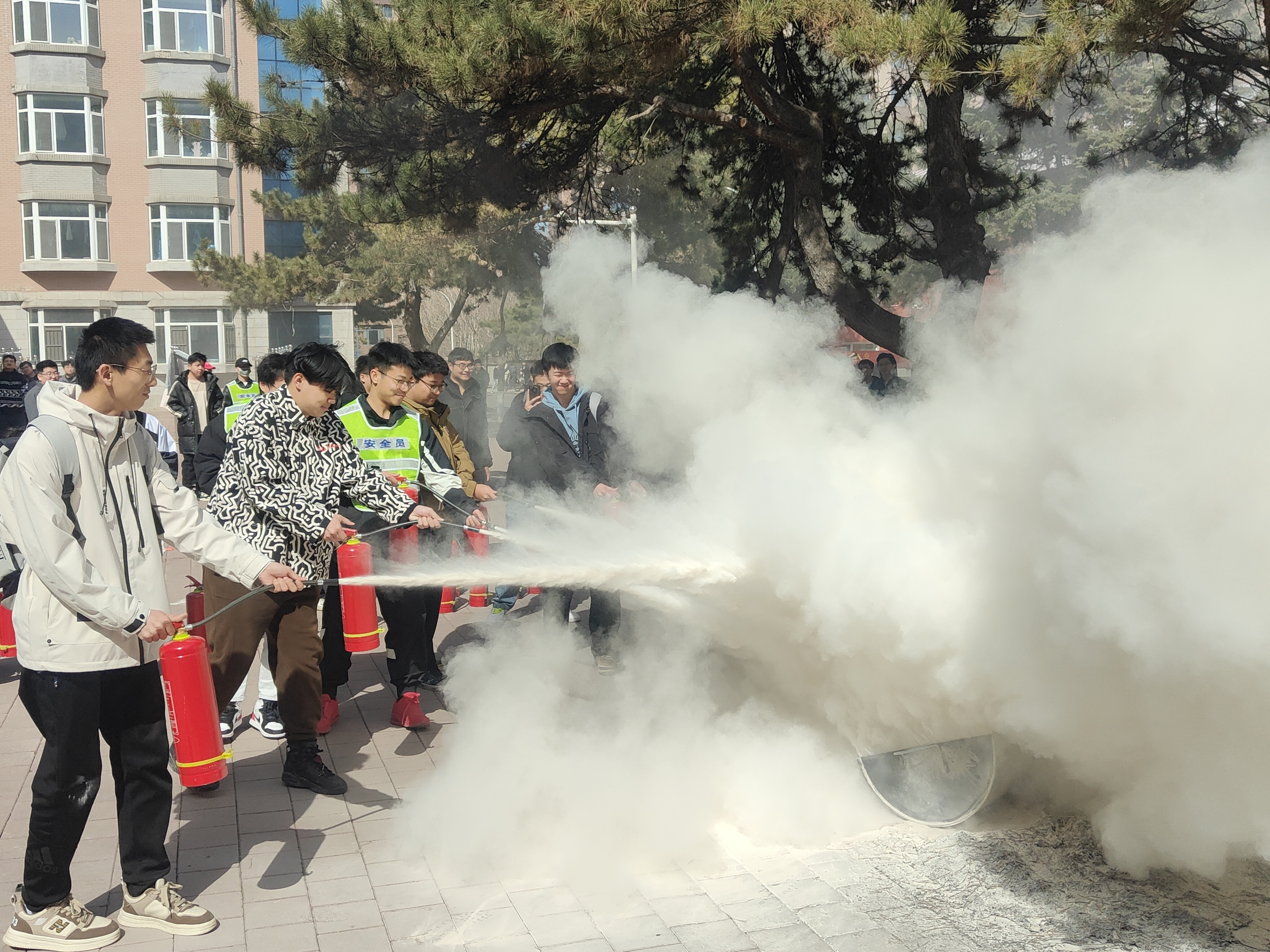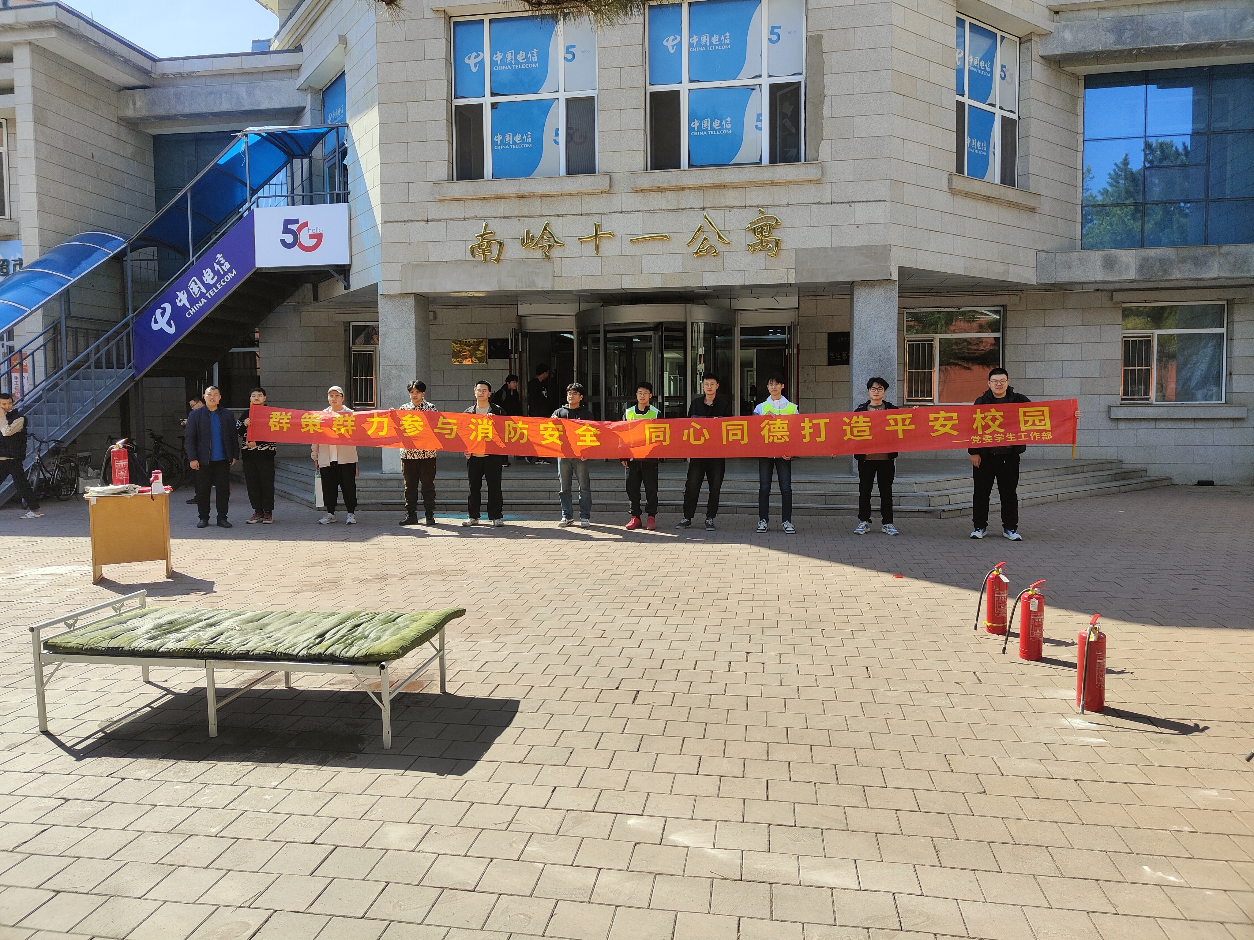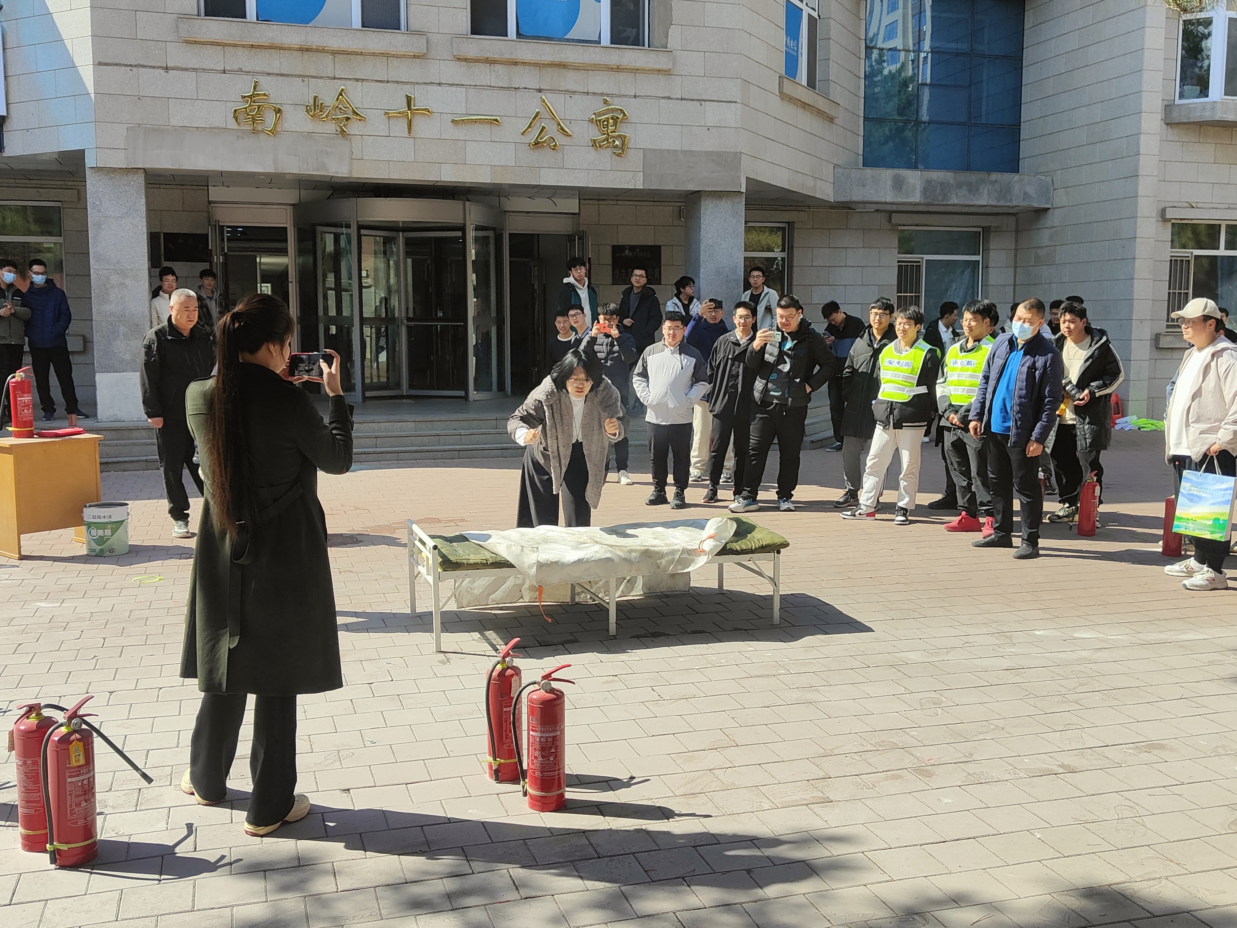 东区学生办公室、东区保卫办公室、南岭校区各学院在十一公寓前开展了一场消防演习活动。