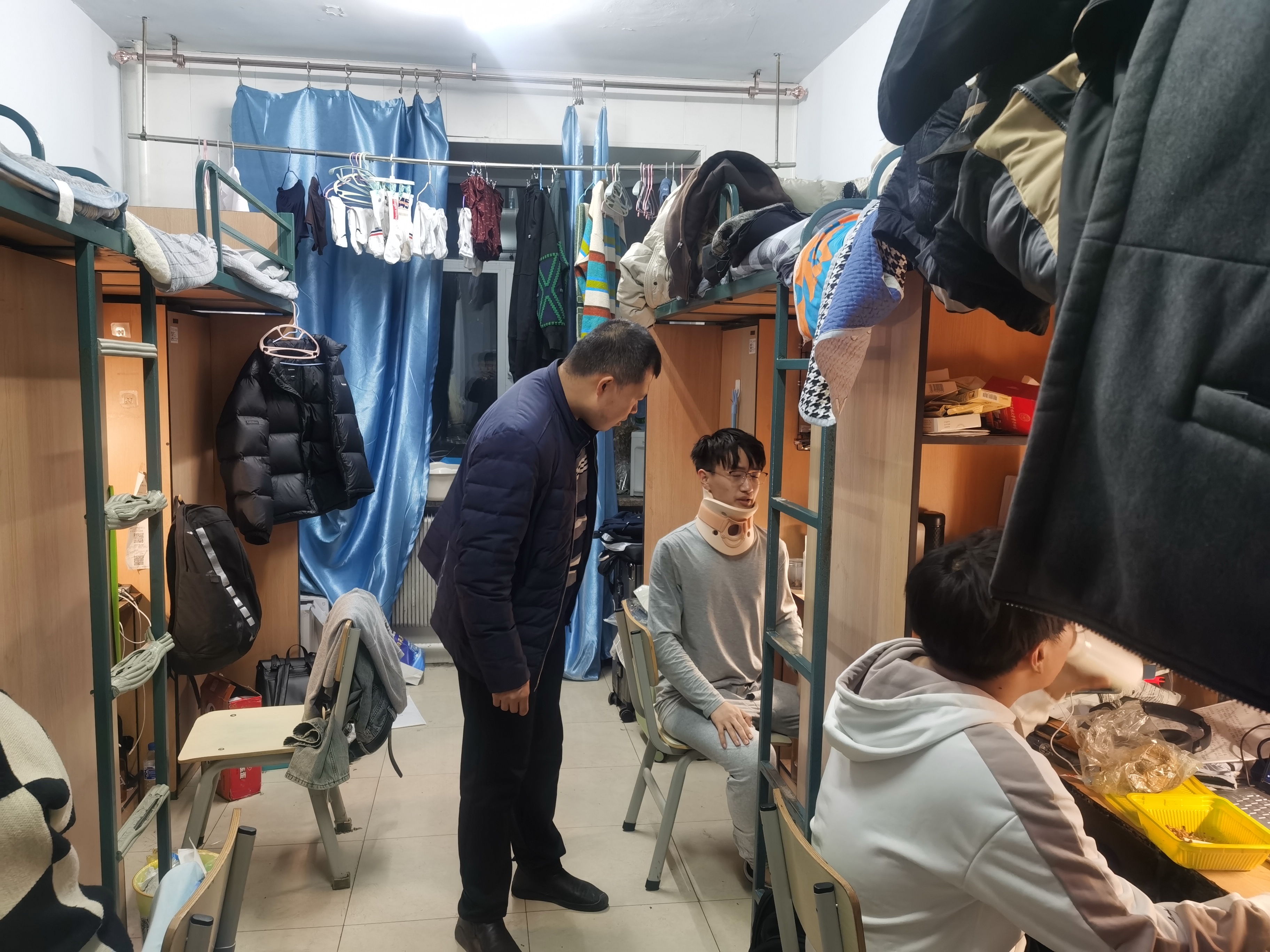 在走访过程中,严老师仔细检查寝室的用电安全、消防安全以及卫生状况,确保无安全隐患。同时,严冬老师还详细询问了学生们假期的生活情况,了解他们是否遇到了什么困难或问题。严冬老师特别强调了寝室安全的重要性,提醒学生们要注意用电、用火安全,避免使用违规电器。他还鼓励学生们要养成良好的生活习惯,保持寝室的整洁与卫生。