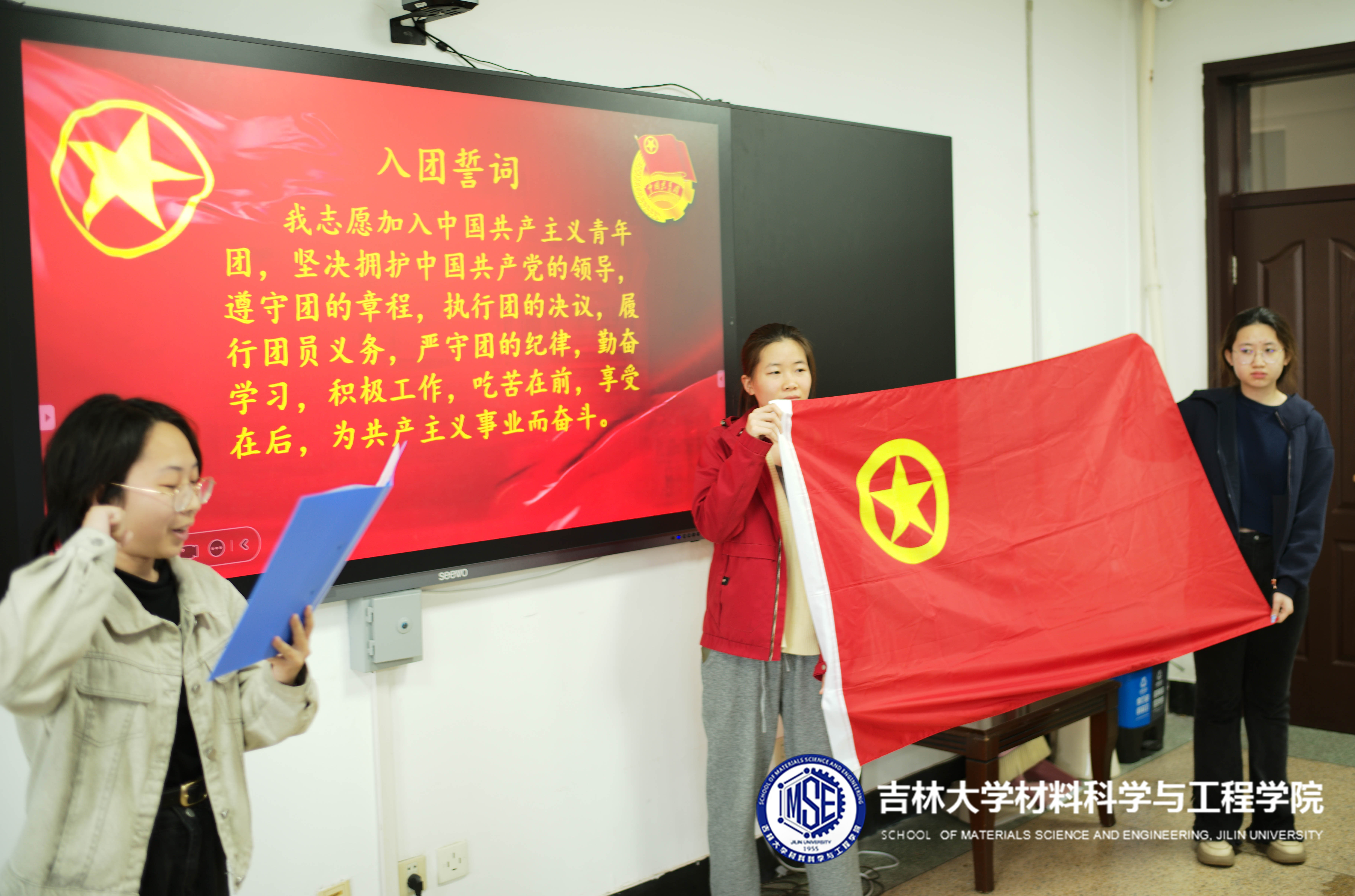 活动伊始,全体起立,奏唱团歌。在鲜艳的团旗下,大家高举右拳,目光坚定,庄严宣誓:“我志愿加入中国共产主义青年团,坚决拥护中国共产党的领导……”铿锵有力的誓言在报告厅内久久回荡,字字句句既是对共青团组织的庄严承诺,也是对初心使命的再次叩问。每一位团员神情肃穆,在宣誓的过程中,深刻感受到作为共青团员的责任与担当。