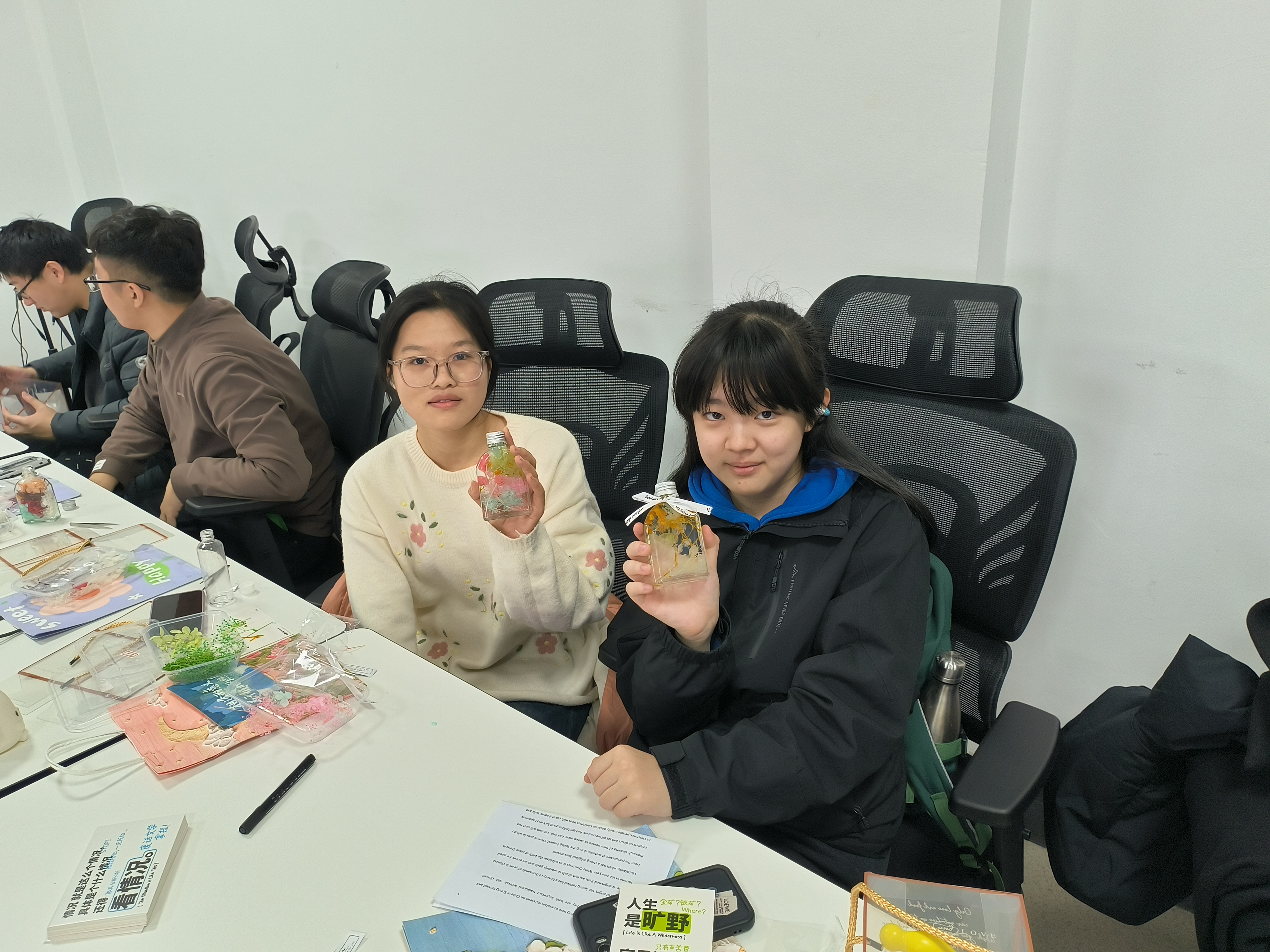 活动精心设计了三个主要环节:坏情绪暂停手册、解忧杂货铺和心中花房。在坏情绪暂停手册环节中,同学们可以挑选自己喜欢的明信片,将写有烦恼的明信片投入“树洞”,以此来达到短暂的情绪释放效果。而解忧杂货铺环节时,同学们可以从“好事盲盒”中抽取带有暖心语句的祝福卡片,还可以收到一份甜蜜小礼物,鼓励大家发现生活中的美好。最后的心中花房环节,同学们可以亲手制作属于自己的“浮游花瓶”,不仅能帮助同学们集中注意力、放松心情,还能让大家体验到满足感与成就感