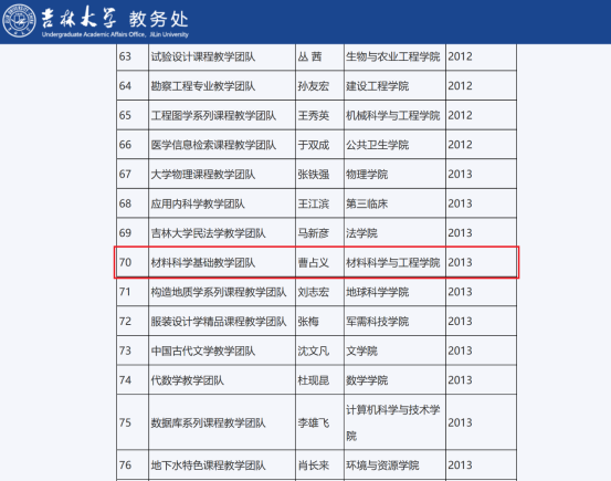 3. 吉林省优秀教学团队:材料科学基础教学团队,吉林省高等学校优秀教学团队(2013年),吉林省教育厅,2016.10.07
