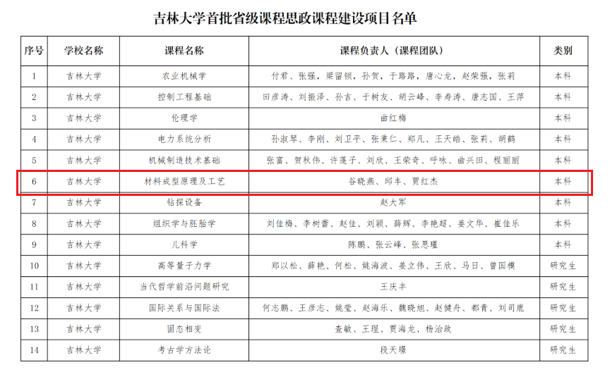 5. 吉林省首批省级课程思政示范(建设)项目:材料成型原理及工艺“课程思政”示范项目,吉林省教育厅,2021.04.25